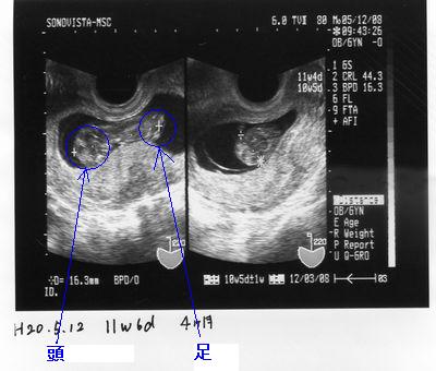 エコー写真ですが、左の写真で黒くヒョウタンの形になってるのが胎盤でその中にある白く細長い物体がJ’rらしく、身長は約4Cmで左側が頭で右側が胴体、足となってるそうです。