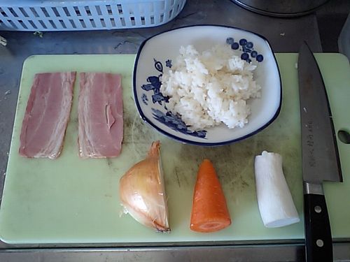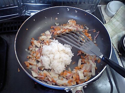 たまねぎが透明になってきたらご飯を入れて混ぜるように炒めて