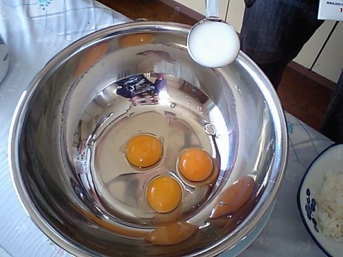 ボールに卵3個と牛乳を1 1/2を入れて