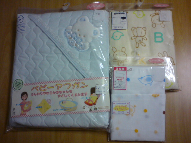 おくるみ(ベビーアフガン)と湯上り用タオルとお風呂で体を洗う時に使うタオル