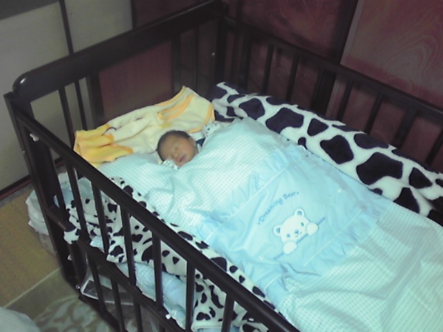 昨夜のうちに組み立てていたベビーベッドに寝かせてみました